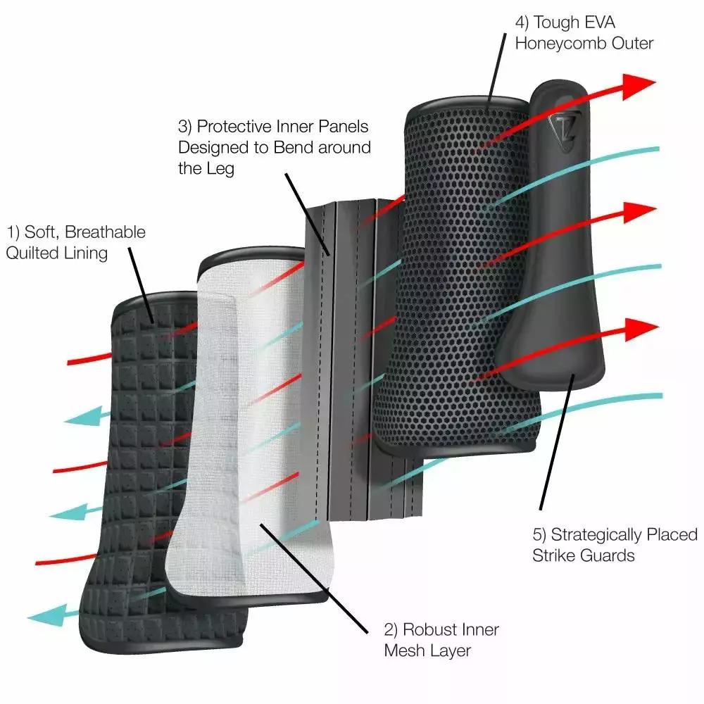 En als laatste, de vijfde laag, is strategisch geplaatst voor extra bescherming bij aantikken. Bij de voorbeenbeschermers zit deze extra bescherming zowel aan de voor als achterkant van het been; bij het achterbeen juist aan het grootste deel van de binnenzijde.